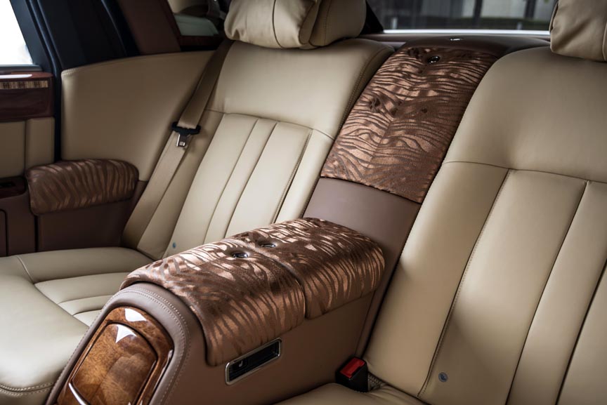 One of the final Bespoke commissions of the seventh generation Phantom Extended Wheelbase was crafted for an entrepreneur in the Far East, showcasing the ingenuity and application of the marque’s craftspeople through the art of embroidery. In this instance, they exquisitely replicate the pattern of tiger fur in the rear centre console. Beyond that, this stunning example features a wealth of unique interior fittings, echoed with a subtle gold coachline and motifs on the Madeira Red exterior. The cabin of this Phantom is furnished in a two-tone design of Moccasin and Fawn Brown leather, and is embellished with multiple personalised motifs stitched into the hide and laid into the veneer, all by hand. Bespoke white instrument dials contrast with a Consort Red steering wheel rim – elegantly expressing the breadth of colour palette at the disposal of the marque’s patrons when creating truly unique Bespoke commissions.