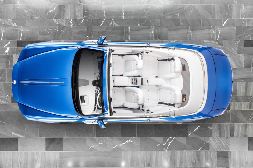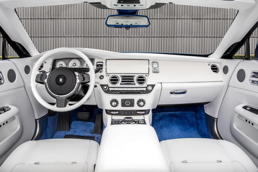 US collector Michael Fux, a connoisseur collector, delights in challenging Rolls-Royce’s designers and craftspeople to develop truly unique materials, hues and features. The results serve as some of the boldest and most emblematic examples of Bespoke design ever executed at the marque’s centre of excellence in Goodwood. When Mr Fux came to commission his first Dawn for handover at Pebble Beach, he came to develop his very own colour, dubbed ‘Fux Blue’, which will remain reserved for his exclusive use. The stunning exterior shade is complemented by a blue hood in the same tone, in contrast to the Arctic White rear deck and fittings to the interior. In order to ensure perfect sartorial harmony, the marque’s designers clothed the entire interior including steering wheel, instrument panel cowling and interior veneers in Artic White, creating a truly unique and contemporary aesthetic.