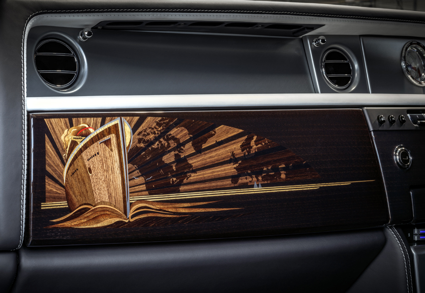 The art of marquetry – so beautifully used throughout Phantom’s life – depicts a stylised 1930s ocean liner, reflecting this particular patron’s fascination with the design and iconography of this grand era. The nautical theme continues with the application of tone-on-tone embroidery evoking the movement of the sea, exquisitely applied to the interior’s Powder Blue leather.