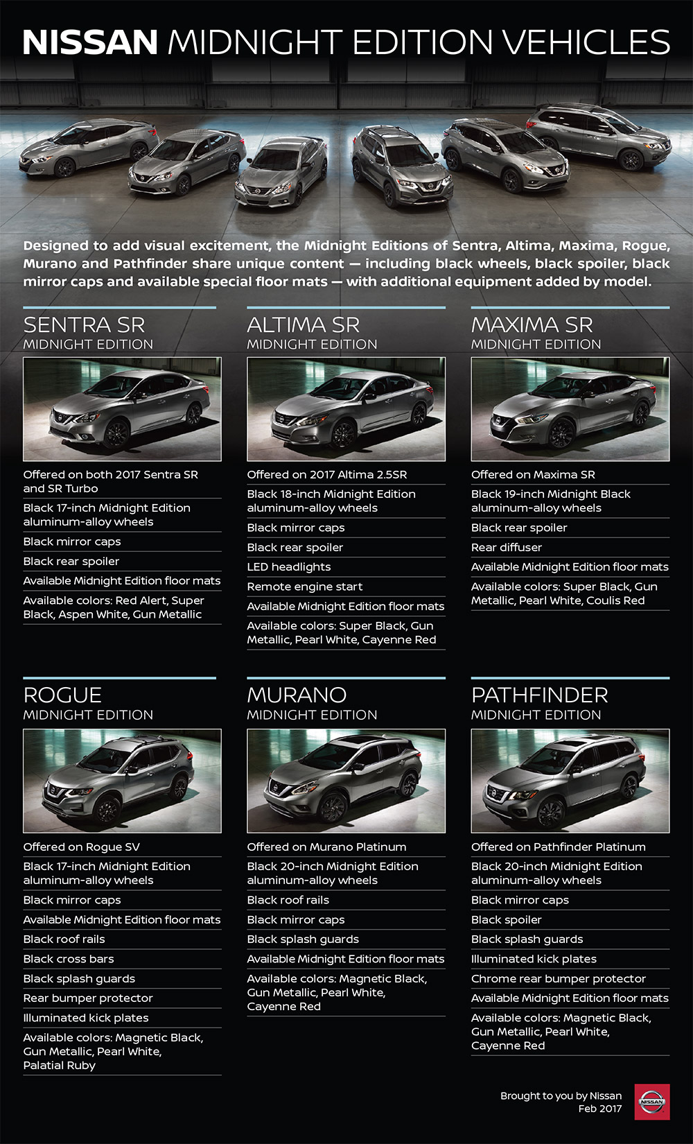 The Midnight Editions will receive extensive online marketing support beginning today and can be found at NissanUSA.com.