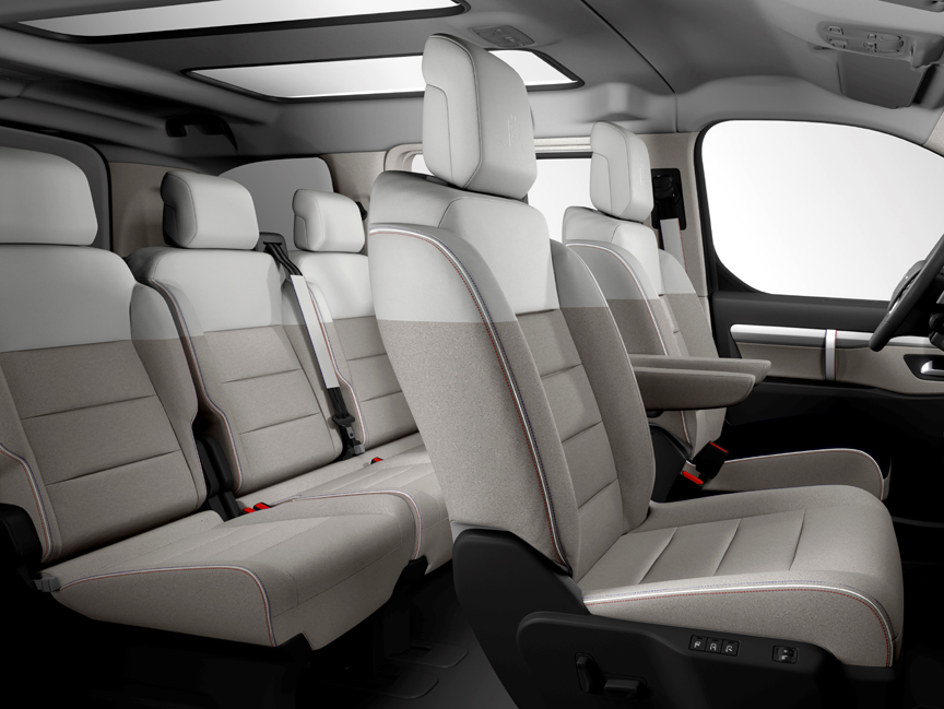 Fully in harmony with the Citroën Advanced Comfort® programme for the well-being of body and mind, the seats on the SpaceTourer 4X4 Ë Concept are remarkably comfortable and together form an original interior layout. Able to house up to nine people, the XS version here takes on a 2+2 configuration with two sliding individual rear seats fitted with armrests. With an uncompromising combination of comfort, practicality and aesthetics, the concept car has a unique interior look and a top-quality two-tone treatment. The seats are upholstered in soft and warm materials. White leather graces all the upper seat backs and headrests. On the lower two-thirds of each seat, mottled grey alcantara leather creates a stunning visual contrast.