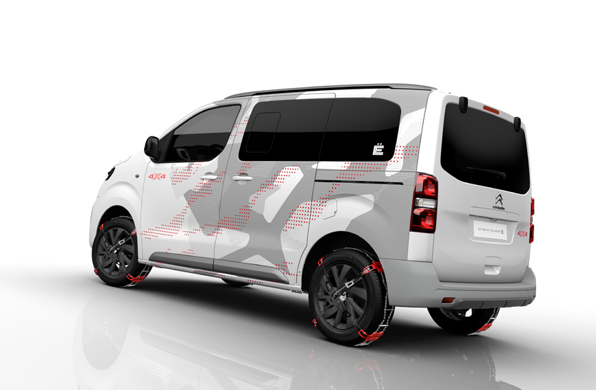 Combining the best features of vans and SUVs, the design above all emphasises the concept car's all-terrain abilities. The SpaceTourer 4X4 Ë Concept is equipped with special front and rear protective skid plates and roof bars with a satin aluminium finish. Recognizable with its "4X4" logo under the door mirrors and on the tailgate, it also features tyres with snow chains.
