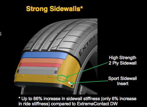 For the ExtremeContact Sport there were changes to the sidewall design, the bead and its seating surface design, and the apex (where and how the sidewall wraps around the bead seat). That’s not to mention compounds, cap plys, tread design and appearance of the sidewall.