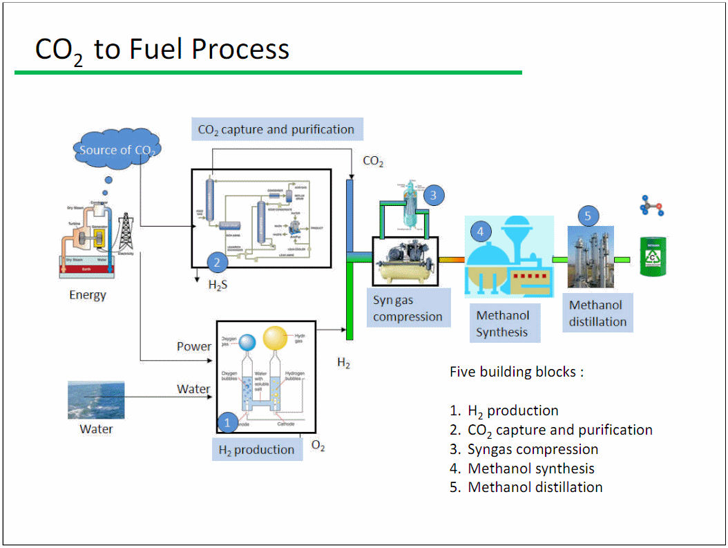 So the second leg of our methanol economy approach is to regenerate or recycle carbon dioxide initially from sources where it is present in high concentrations, like flue gases from a power plant burning natural gas. But eventually, and this won’t come overnight, we could just take out carbon dioxide from air.