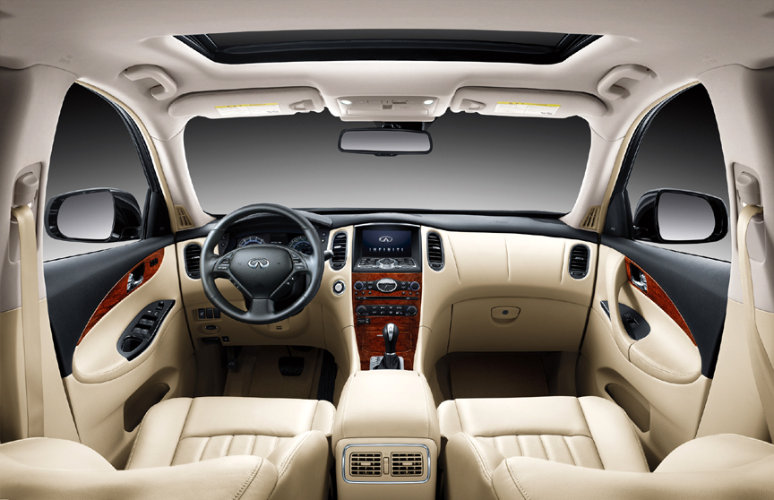PERFORMANCE: The VQ37VHR 3.7-liter V6 under then QX50’s hood isn’t the newest bit of tech around, but it works, and very well. It’s a four valve per cylinder aluminum alloy unit with continuously-variable cam phasing for optimum torque and emissions and friction-reducing technologies to improve efficiency. With maximum 325 horsepower (at 7000 rpm) and 267 lb-ft of torque (at 5200 rpm) there is never any shortage of power for passing or merging or just driving. The seven-speed automatic transmission can aid both performance and fuel efficiency, with low-ratio lower gears, overdrive sixth and seventh, and minimal gaps between ratios. Like nearly all contemporary automatics, it’s programmed to optimize fuel efficiency, so will sometimes be a gear or two high when quick acceleration is demanded. It downshifts quickly enough, and if maximum performance is desired there is manual mode.