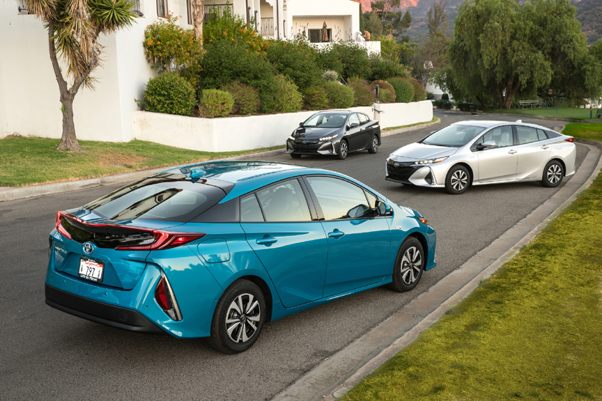 The 2017 Prius Prime comes in Plus, Premium, and Advanced grades. Compromises in comfort and convenience for high mileage and greater electric range are not required. All are well-equipped, with the Plus having LEDs for projector headlights, daytime running lights, and tail lights plus heated folding outside mirrors. Inside are heated front seats, automatic climate control, tilt- and telescope-adjustable steering wheel with controls for audio, climate, information, and Bluetooth® phone systems, plus Toyota’s Entune™ audio, navigation, and app system. And the Smart Key system with pushbutton start/stop, and power points and USB ports. Premium gets auto on/off headlights, SofTex synthetic leather seating, power adjustment for the driver’s seat, fancier interior trim, and Qi-compatible wireless device charging. Advanced means standard LED foglamps, rain-sensing wipers, remotely-controllable climate control, a color head-up display, and electronic safety features like blind-spot monitoring with rear cross-traffic alert and parking sonar. All models have Toyota’s Safety Sense P and Star Safety Systems as standard equipment. The Advanced gets the Safety Connect system as well.