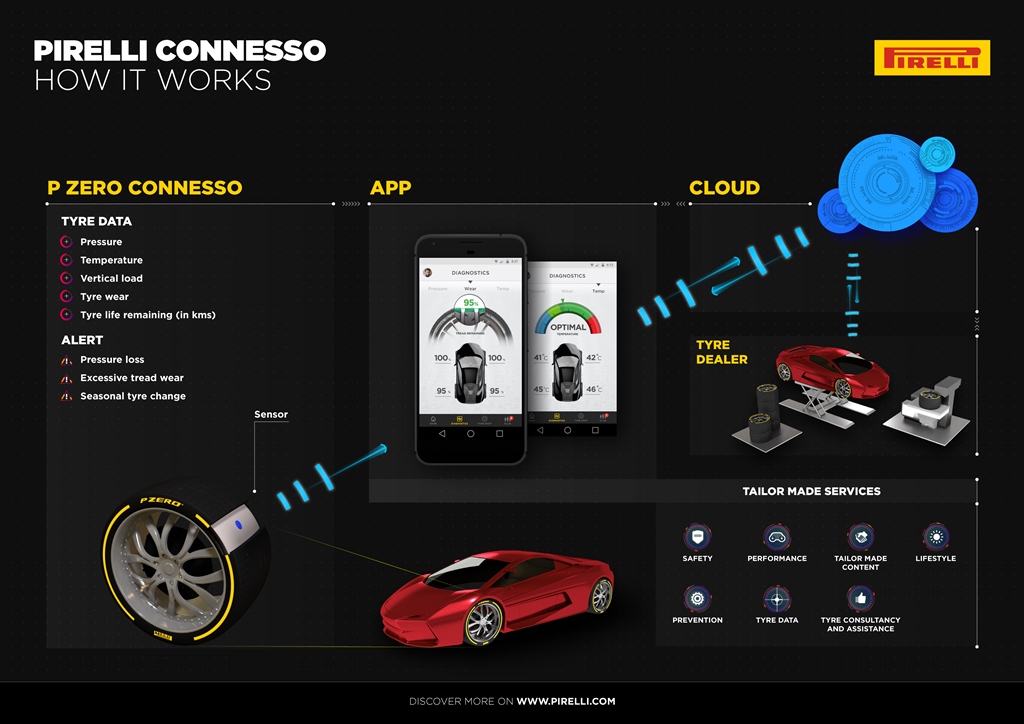 Pirelli Connesso is formed of a sensor embedded in the tire connected to the Pirelli Cloud and to a smartphone app, providing an interface that allows drivers to constantly communicate with tires.