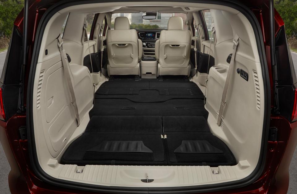 Among the innovations Chrysler claims for the Pacifica is Stow ’n Go seating. The second row seats fold and drop into a well behind the front seats. There’s a button that moves the front seats forward to make stowage easier. The third row seats also stow and fold into a deep well behind them. This well also increases cargo capacity the the seats aren’t in it. With all the seats folded there are more than 140 cubic feet of storage, the most in its class. The flat floor is large enough to carry the standard 4x8 plywood sheet.
