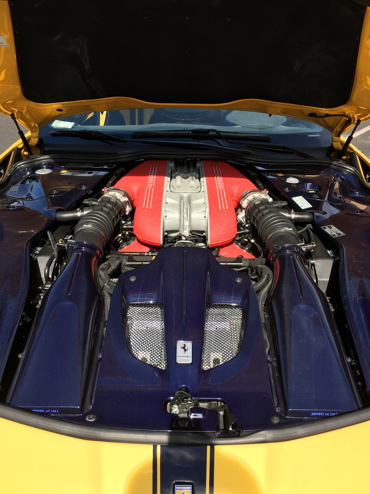 The 6.3 liter V-12 has a horn section. It blares, blasts, plays notes and talks to you with aural feedback like only a Ferrari V-12 can. The brass section changes tunes depending upon the gear and throttle position. Rated at 769hp at 8500rpm, up from 730hp in the Berlinetta. The torque peak is 519lb-ft. at 6250rpm but 80% of that available from 2500rpm and the redline is 8900 rpm. The power builds in a linear rush with no dead spot or lacking under a particular rpm, a rheostat connected to the foot similar to the wife’s LaFerrari. And as he says, it is a front engine LaFerrari, albeit noticeably slower. Well slower to him.