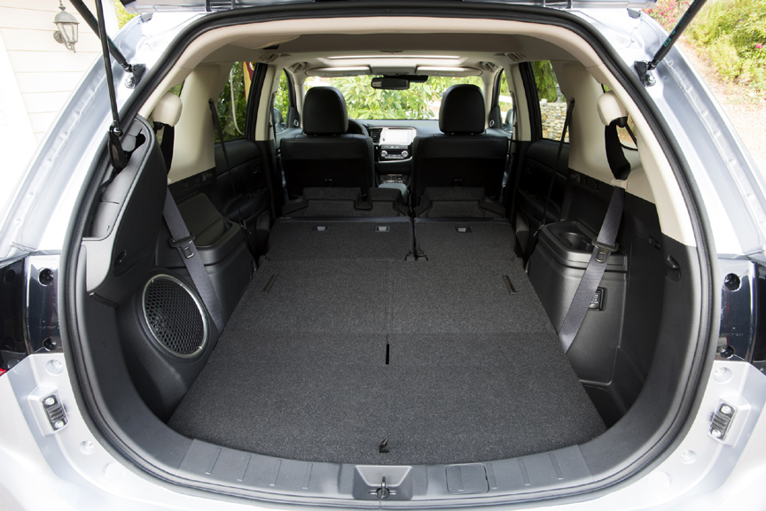 And a GT with the Touring Package of safety and convenience features is this week's test vehicle. Good news -- the GT Touring Package has dropped considerably in price, from $6100 in the 2014 example I tested to $3,350 in 2016 to $1,500 as of this writing. Some of that may be lowered cost of the electronics within; realignment of standard features and option packages also figures into the equation. Since last year, the package has dropped navigation — you likely have that in your smartphone anyway — and added automatic high beams, a heated steering wheel, and a very useful multi-view surround camera system. The Outlander may look a bit different than other three-row crossovers, but that's all the better for those inside. Fore-and-aft adjustment for the second row means that, depending on the size of the forward occupants, the two-place third row can accommodate small adults, not merely small children as is too often the case in smallish "three row" vehicles. The V6 had good power when needed, and the Outlander seemed more comfortable and stable with more people and stuff inside. Go ahead and fill it, it likes that… Fuel economy can be a drawback for seven-passenger vehicles of all descriptions -- but not this one. I got around 19 mpg around town and mid-20s on the highway, with a 20-mpg average for the week.