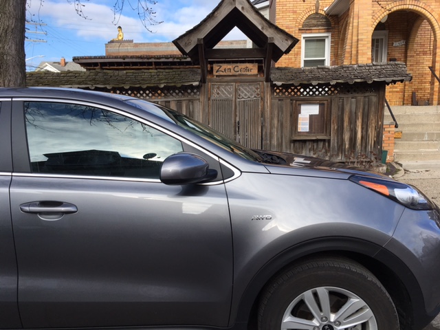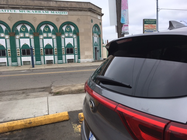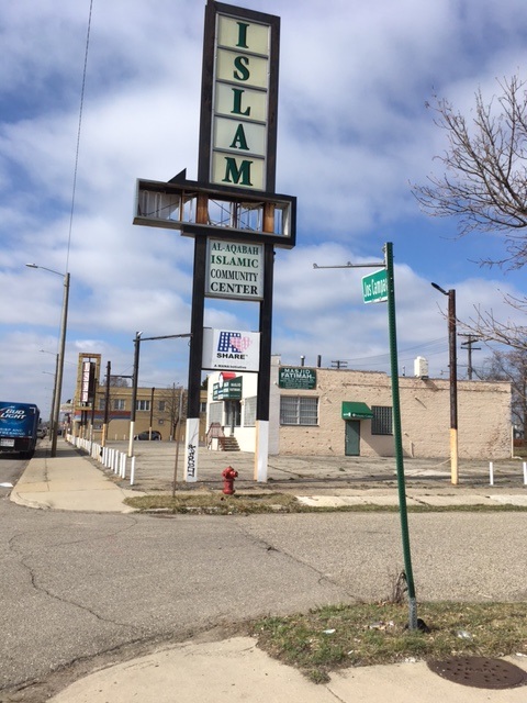 Looking north a ways, I see the used car lot for Woody Pontiac, once one of the largest selling Pontiac dealerships in the Michigan. This sector of street was called Automotive Row. Now there's a historical marker and the sales office is a Mosque serving some of the 20,000 Bangladeshi-Americans in Hamtramck and Detroit. The door is closed, so I decide to visit a Buddhist temple instead.