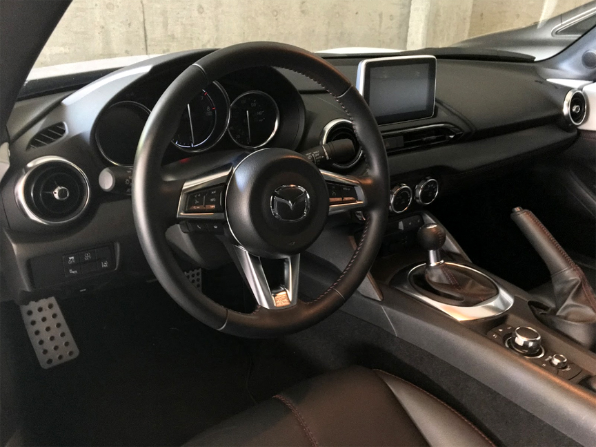 Mazda utilizes several philosophies in their vehicle design and construction. SKYACTIV is the effort to reduce weight while improving safety and efficiency. Their Jinba Ittai process is to elevate the driving experience. This was done by redesigning the cockpit and ergonomics for a more driver centric experience and better fit. KODO theme is the Soul of Motion with a long hood, short overhangs, large wheels pushed to the far corners, and looks good with the top or down. Not many convertibles can make that last claim.