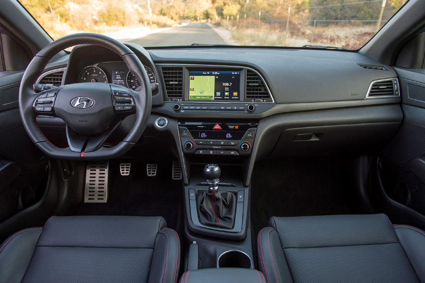 The turbocharged version of Hyundai’s 1.6-liter Gamma four-cylinder sits under the Elantra Sport’s hood. Its maximum 201 horsepower and 195 lb-ft of torque handily beats the naturally-aspirated 2.0-liter engine in the regular Elantra, with 54 more horsepower and an additional 63 lb-ft. Torque peaks from 1500 through 4500 rpm for instant acceleration even without downshifting. The chassis is upgraded to deal with the extra power, with firmer springs and shocks, larger stabilizer bars, and larger brakes. The torsion beam rear axle found in lesser Elantras is replaced by an independent multilink system.
