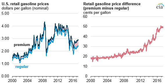 The difference between U.S. average retail prices for premium and regular gasoline reached 50 cents per gallon in late 2016, and it has remained near that level so far in 2017. This price difference, or spread, has been generally increasing since 2000. Many factors on both the supply and demand sides are influencing this trend.
