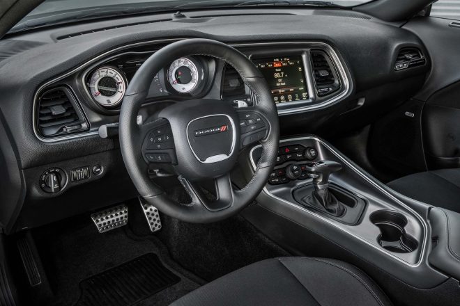 Styling and design reflect the earlier-referenced “throwback,” or retro theme, with simple, unpretentious details inside and out. Challenger, to me, looks and feels to be the largest of the modern pony cars and it sits on essentially the same Mercedes-designed platform as the Charger and Chrysler 300. If you look at the new Challenger next to the iconic original from the early 1970s you’ll find it is stylistically true to its heritage though considerably larger. Our test car sports huge 20”X9.5” forged, painted aluminum wheels with a dull-black color that mitigates the dust coming from the high performance brake pads. Illuminated rings around the headlights (the outboard two are lights with the inboard two being air intakes), large areas of flat-black, or “satin black” surfacing that compliments the car’s “Destroyer Grey” paint, bold graphics, superfluous-but-cool hood pins and an uncovered fuel filler door confirm the special nature of this car.