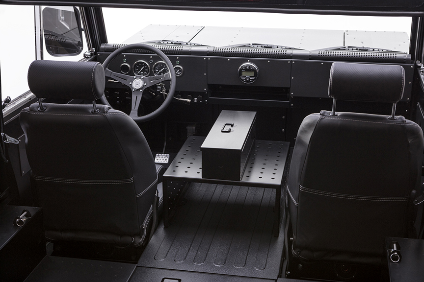 The Gunhouse Grey color and black accents are carried through to the interior with black leather seats. As this is a vehicle designed with the rugged outdoorsman in mind, the Bollinger SUT seats up to four occupants wrapped in a steel passenger safety cage. For ease of cleanup the interior can be fully hosed down as all of the instruments have rubber seals and gaskets and polyurethane-coated floor pans.