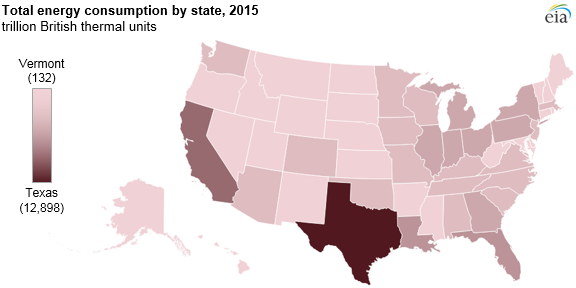 In 2015, Texas consumed a total of 13 quadrillion British thermal units (Btu), or about 13% of total U.S. energy consumption. Texas has consumed the most energy in every year since 1960, the earliest year for which EIA has data. California ranked second in energy use, with a total consumption of 8 quadrillion Btu, about 8% of U.S. total energy use.