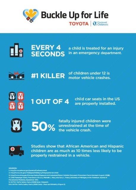 Buckle Up for Life is a national car seat safety program for families, created by Toyota and Cincinnati Children's Hospital Medical Center in 2004, to help keep child passengers safe. The program partners with leading children's hospitals, community organizations, local governments, schools and non-profit organizations to teach parents and children about the proper use of car seats and seat belts and to provide free car seats to families in need. Buckle Up for Life has reached more than 65,000 people nationwide and has developed partnerships in 32 cities including Dallas, Memphis, Phoenix, Chicago, Houston, Las Vegas, Los Angeles, Philadelphia and San Antonio – and expands to new partners each year. In one city alone, the program nearly tripled the use of proper car seats in participating families. Toyota has provided funding for over 50,000 car seats for families in need. For more information about Buckle Up for Life, please visit www.buckleupforlife.org.