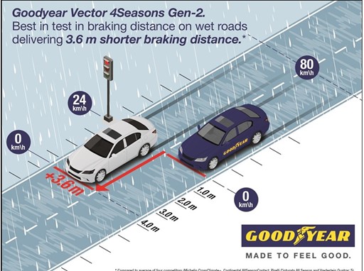 Recent tests from independent testing body TÜV, show that Goodyear’s Vector 4Seasons Gen-2 excels in rain and snow, compared to competitors.[2] TÜV tested Goodyear’s All Season tire and its competitors against different performance criteria related to the All Season segment such as braking in wet conditions and braking on snow. Results from the test concluded that Goodyear’s latest All Season tire, the Vector 4Seasons Gen-2, has the shortest braking distance on snow-covered roads and wet roads compared to tested competitors.
