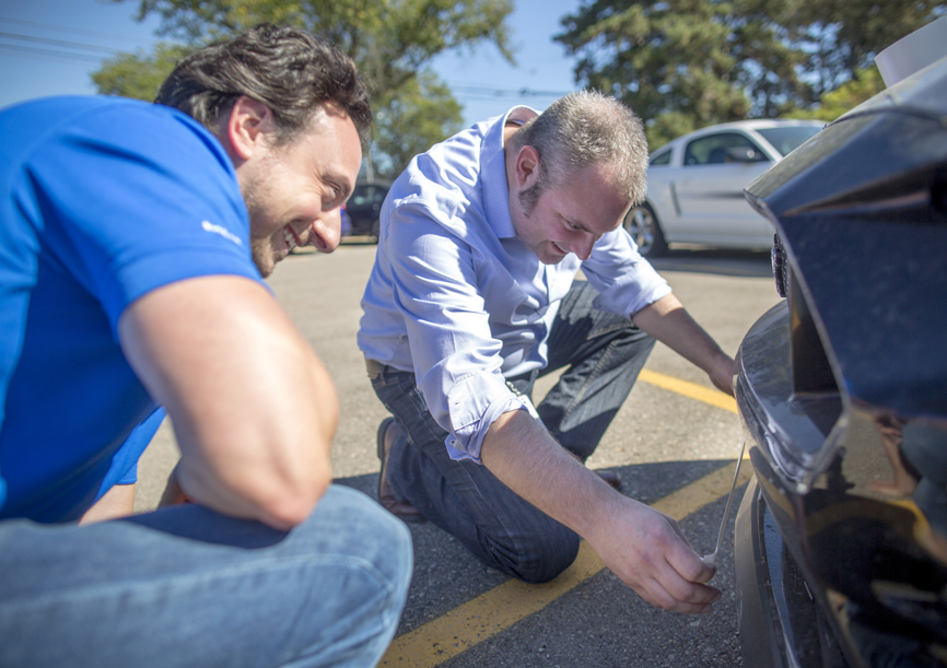 ![]() Ford Mustang engineers – Mike Del Zio (left) and Jonathan Gesek (right) – use tape to modify the front grille reduce lift and create a better handling car. |