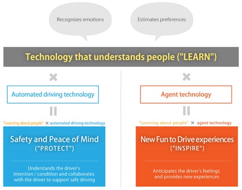 The core technology common to the TOYOTA Concept-i series is a technology that understands people (LEARN), applying AI to recognize emotions and estimate driver preferences. The technology that understands people (LEARN) and automated driving technology combine to lead the driver to safety and provide peace of mind (PROTECT). In addition, by combining the technology with the agent technology, it will be possible to advance technology to the point that the driver's feelings can be anticipated, leading to new Fun to Drive experiences (INSPIRE).