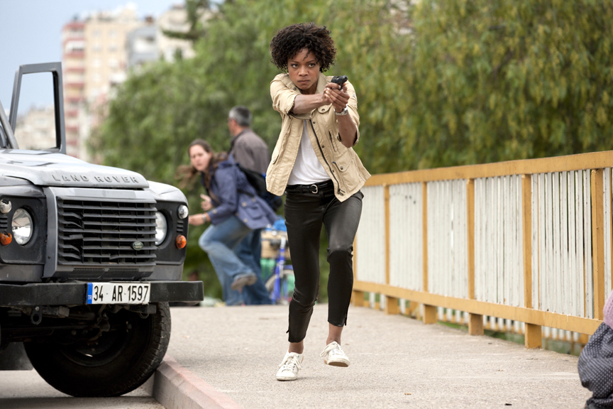• Eve Moneypenny (Naomie Harris) costume including Belstaff jacket, H&M silk vest, J Brand leather trousers and a Skyfall film poster showing Naomie wearing the outfit