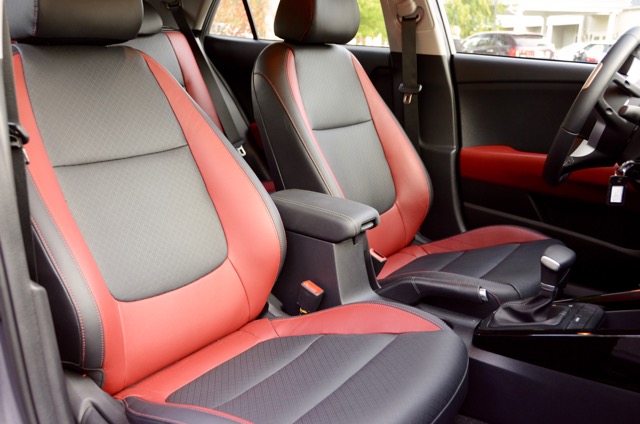 A 7-inch touchscreen is well placed in the center of the instrument panel allowing access to UVO3 voice recognition, Apple and Android smart phone integration as well as the six-speaker audio system, Bluetooth hands-free functionality, and a rear-view camera system. The EX media test car was nicely appointed with the optional red leather interior accent trim.