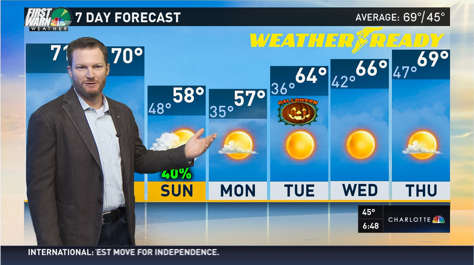 Earnhardt Jr. had no trouble navigating new territory and delivered the weather flawlessly with the help of respected Charlotte weather forecaster Larry Sprinkle. In addition to providing a seven-day outlook, Earnhardt Jr. discussed the weekend weather implications for the NASCAR Cup Series race at Martinsville Speedway.