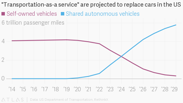 He predicts the companies that actually manufacture cars will become less valuable as the importance of those that own fully autonomous fleets grows. Expect the relationship between companies like Ford and Uber to resemble the one between Foxconn and Apple: manufacturing companies make products in obscurity, while technology companies grab most of the visibility and profits. Premium-car makers and dealerships are doomed. As transportation is commodified into an on-demand service, the market for individually owned cars will shrink, and be kept afloat by only a few car fanatics.