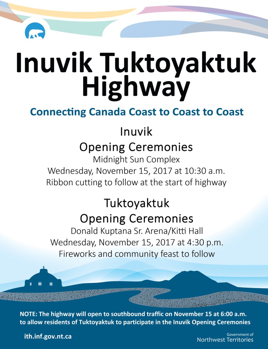 "This is an historic day for Canada. Our country is connected by road – for the first time ever – from coast to coast to coast. The federal government is proud to have supported the construction of the Inuvik Tuktoyaktuk Highway. It is a key piece of infrastructure that will have a long-lasting, positive impact on the lives of Northerners. Moreover, this investment will help ensure that the people of Tuktoyaktuk have year-round access to essential services and a reduced cost of living. Congratulations to everyone involved in realizing this important nation-building project."