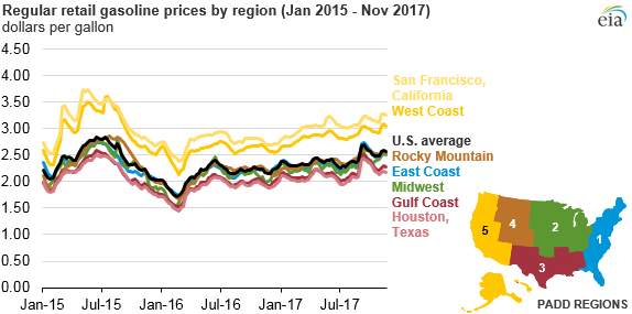 EIA’s November Short-Term Energy Outlook forecasts that both crude oil and gasoline prices will decrease in the coming months, with U.S. average gasoline prices reaching a low of $2.31/gal in January 2018. Retail gasoline prices are forecast to average $2.45/gal in 2018, compared to $2.40/gal in 2017.