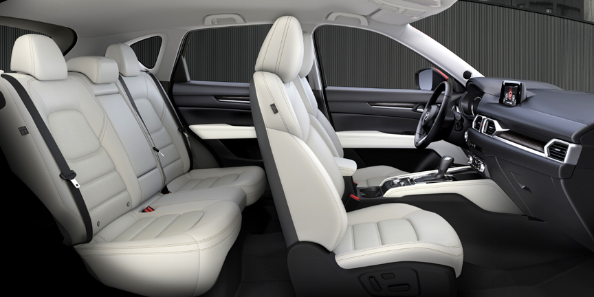 Further building on the GS with Comfort and i-ACTIVSENSE packages, the top-trim CX-5 GT upgrades the seating with 10-way power driver's seat, new 2-position memory driver's seat and 6-way power adjustable passenger seat. All passengers benefit from the upgrade to leather-trimmed seats, and rear passengers are treated to heated seats as well (outboard only). LED fog lights and tail lights, Adaptive Front-lighting System, BOSE® Premium Sound System with 10 speakers, navigation, and 19-inch alloy wheels are also standard for the CX-5 GT. The available GT Technology Package includes the equipment from the GX/GS i-ACTIVSENSE Package along with a windshield-projected Active Driving Display head-up unit with Traffic Sign Recognition, and SiriusXM® satellite radio with 3-month trial subscription.