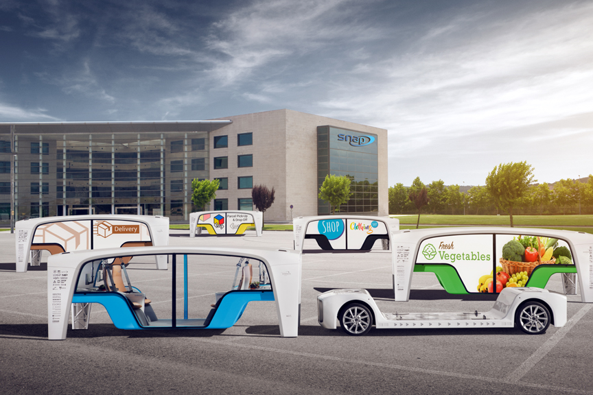 There is also a host of technical innovations in the appealing exterior of the Snap, which is more reminiscent of architecture than of automotive design. For example, from German lighting specialist Osram Opto Semiconductors, which installs digital license plates as well as the entire lighting system - including interior LEDs that emit ultraviolet light to render bacteria harmless and thereby improve hygiene. The front and rear panels as well as lighting elements in the rocker panels are multifunctional and can display multimedia contents. They come from US company Techniplas, a leader in the design and manufacturing of engineered products for mobility. The safe swapping of the pods is ensured by lightweight-design supports from Swiss Company Georg Fischer.