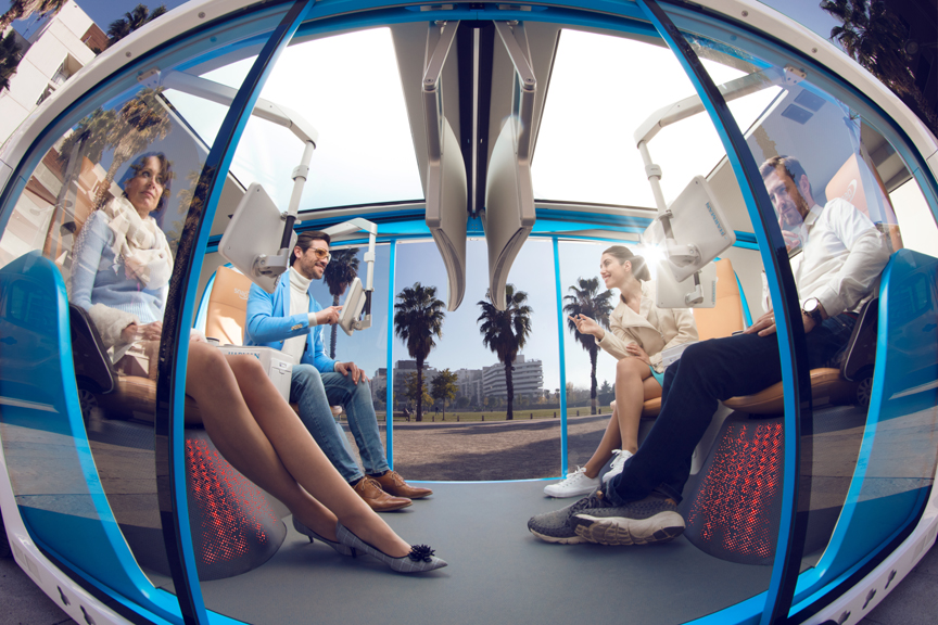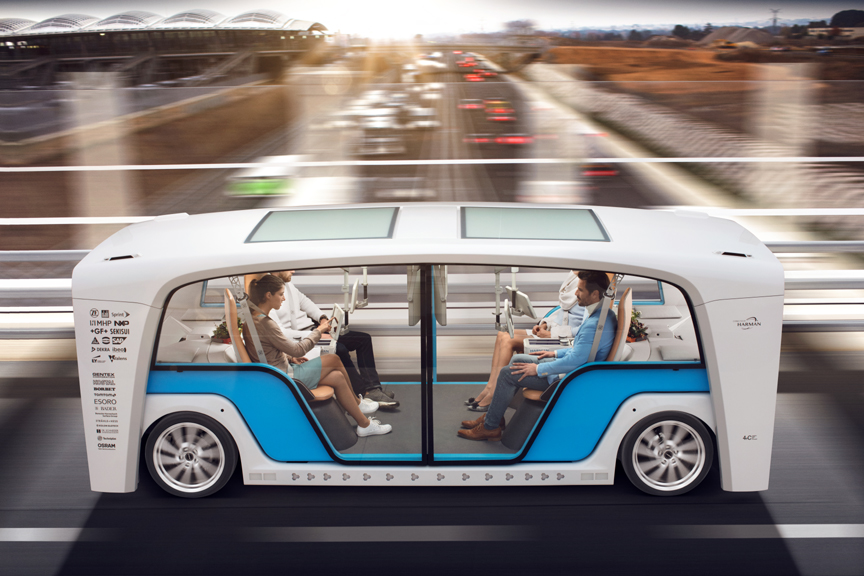 The city runabout is brimming with sensors. For example, US company Gentex is contributing the Iris scanner for occupant detection and dimmable front and rear glass elements, which can also be found on the Boeing Dreamliner. The sophisticated Lidar sensors from Ibeo in Hamburg ensure that obstacles on the road are detected by means of real-time measurement of the light reflections. The Harman Autonomous Drive Platform that is part of the skateboard makes safely moving through city traffic possible. It uses the NXP BlueBox, a sensor fusion solution. In turn, the Smart Antenna, jointly developed by NXP and Harman, ensures safe communication to the world outside as well as a high-speed connection to the Harman Ignite Cloud Platform. With 5G, Car2X, radio tuner, BT, and WiFi, it covers the entire spectrum of wireless networking possibilities. Sprint, a leading US telecommunications company, is committed to ensuring stable networks. Moreover, with highly-sensitive pod recognition and its customized Smart Access solution, the chip giant NXP offers a broad range of technologies that show promise for the future. Europe's leading business software company SAP contributes by enabling the digitized ecosystem through innovative technologies and software solutions in the areas of smart cities, connected health, connected mobility, and transportation. And TomTom provides HD maps for autonomous driving and navigation technologies that enable predictive driving for passengers' comfort. Finally, the Israeli start-up Valens's HDBaseT Automotive connectivity technology connection is responsible for the fast and secure transmission of even ultra-high-definition, high-resolution multimedia signals between the numerous vehicle components.