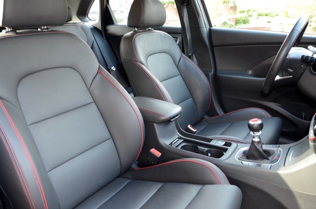 There’s plenty of comfort on the inside too. The front seats are nicely supportive making for good road-tripping. Leather seats (also heated in front) and leather steering wheel rim, red accent stitching and also red-finished metal accent trim all make for a sporty look and feel. The 8-inch touch screen is mounted at eye level, which I prefer, and is quite easy to use.
