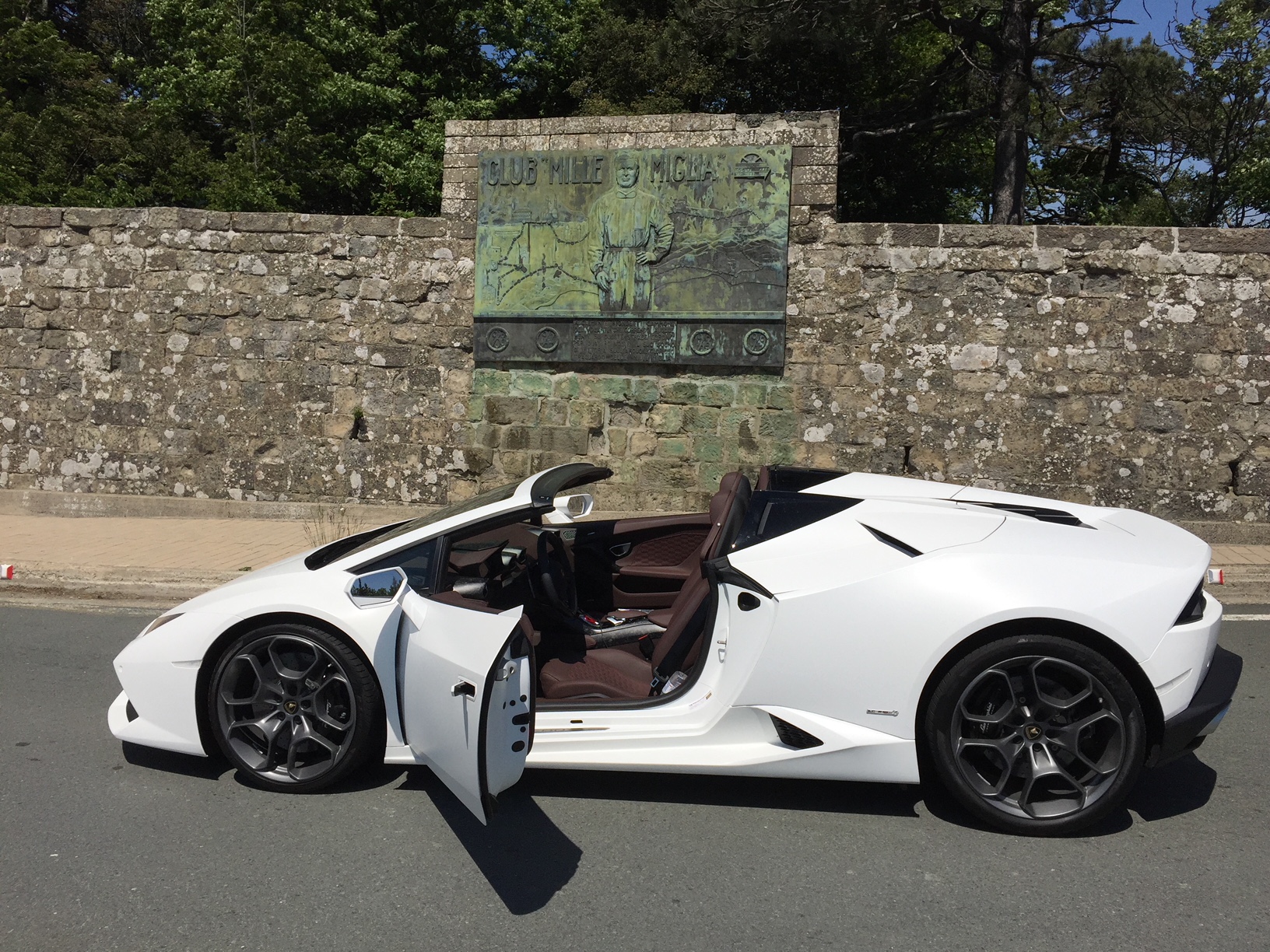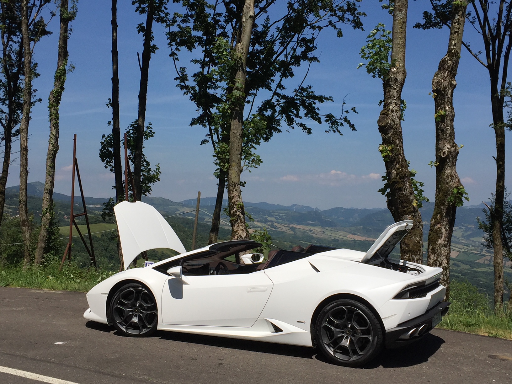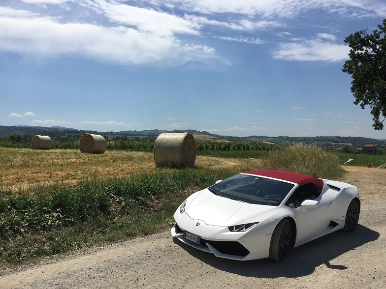 After an hour, and with friends waiting, it was time to saddle up with my ride for the next week, and all of her 640 horsepower. I had previously driven the new spyder at its launch in Miami on a rainy day in February 2016, so this was a real chance to test, what is still, a ‘new model’. The bespoke interior wasn’t totally to my taste, although the cast carbon air vents were certainly and literally ‘cool’ but I dread to think what they cost. The V10 ignites ferociously after you lift the red starter cover and hit the button, settling down into a friendly but only slightly muted baritone burble. Out of the front gates and, with both my father following me in a new Ferrari Lusso GT and another friend in yet another white Huracán, it was off to the famous Futa pass. The roads get narrow and start climbing above the Tuscan hills that allows us all to fully explore the lightning fast yet easily accessible performance of these best in class machines. I’ve always been a roof down guy as one gives up very little in real world performance, particularly considering the enormous improvement in chassis rigidity and development in the last ten years, and gain hugely in the experience of the senses with sun on your face, wind in the hair, the scents of the countryside, and the noise of the engine ricocheting off the scenery, particularly with this crowd of large capacity, normally aspirated ten and twelve-cylinder emotional excitement generators.