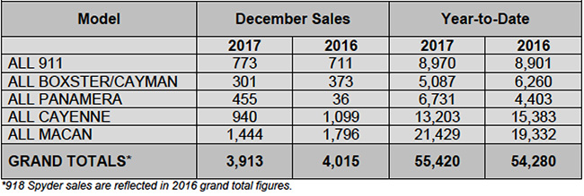 Porsche US Auto Sales December and Year 2017