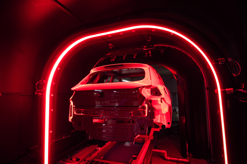 - An all-seeing CAT scan: Once painted, all it takes is 43 seconds to verify there are no deficiencies in the paint application. The vehicles pass through a scanner that checks for smooth surfaces and ensures there are no impurities.