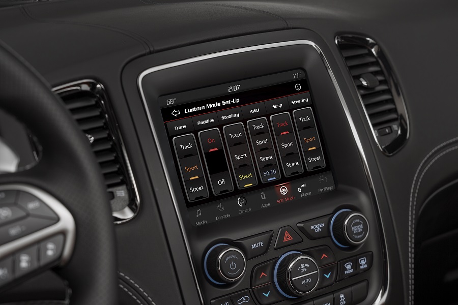 Auto, Sport, Track, Snow, Tow, Valet and ECO modes can be selected via the Uconnect 8.4-inch touchscreen media center housing the new SRT Performance Pages.
