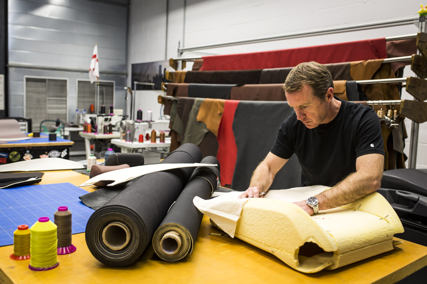 -The background of a car tailor: Nick Allen has 35 years of experience in the sector. “I’ve been creating car interiors by hand since I was 16”, he tells us. He designs patterns in his atelier, striving to come up with the best finishes for the seats, just as a high fashion designer would do.