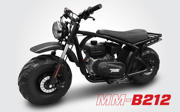 This recall involves model "MM-B212" off-road mini bikes. The recalled bikes have a black powder-coated, gusset-reinforced, welded tube steel frame. Attached to the frame are two pneumatic tires with steel rims that measure 19 inches by 7 inches, a front fork with shocks, front and rear hydraulic disc brakes, and a head light. The bikes are powered by a pull start self-contained 212cc, 7.5 hp gas engine and have a retractable kick stand. The mini bikes weigh 164 pounds and measure 64 inches long by 32.5 inches wide by 36 inches tall. There are two circular "MM 212" decals on the pull start and the transmission cover located on the left and right side of the bikes, a "Monster Moto" decal on the left and right shock absorbers, and an "MM 212" and Monster Moto logo on the left and right frame gussets.