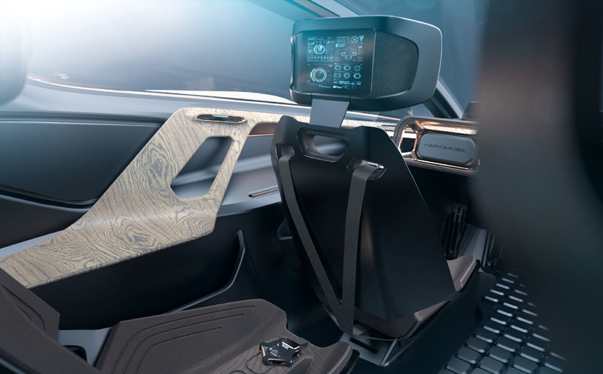 The AeroMobil 5.0 VTOL concept has two electrically driven rotors to ensure safe vertical take-off with horizontal thrust being provided by an electric powered rear mounted pusher propeller. It will seat four passengers providing similar comfort and user experience as next generation electric vehicles. Each occupant will have access to a personalized inflight experience, with flight or drive data and advanced communications and media to ensure occupants stay connected while in the air or on the road.