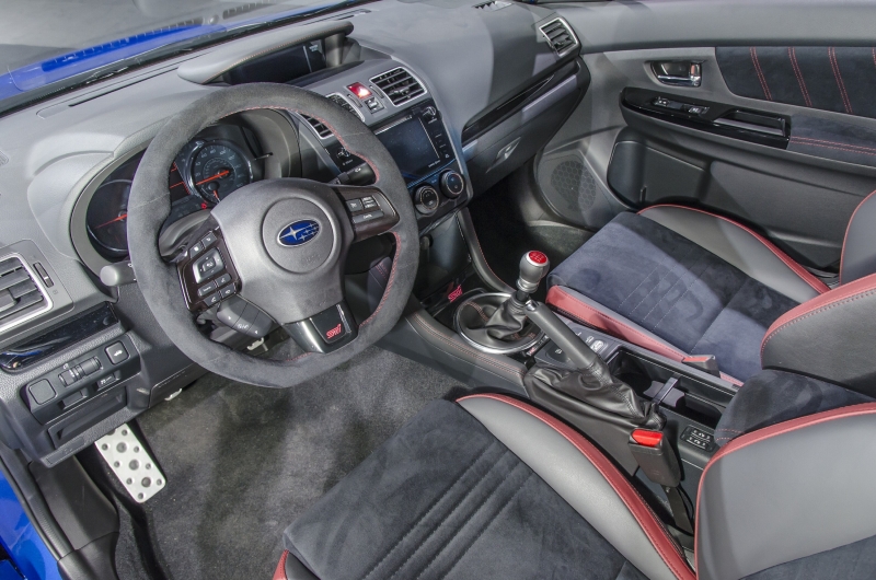 ![]() Subaru enhanced its sporty WRX STI with Alcantara on center-seat insets, steering wheel and door panels with red stitching.(Photo by Thom Cannell.) |