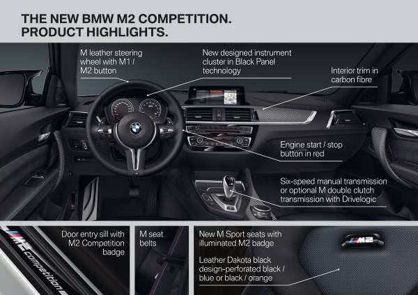With the new BMW M2 Competition (combined fuel consumption with six-speed manual gearbox: 10,0 – 9,9 l/100 km; combined CO2 emissions: 228 – 225 g/km*; combined with optional M Double Clutch Transmission (M DCT): 9,2 l/100 km; combined CO2 emissions: 210 – 209 g/km)*, BMW M GmbH is setting fresh benchmarks in the compact high-performance sports car segment and adding marked refinement to the character of the BMW M2 Coupé. F87