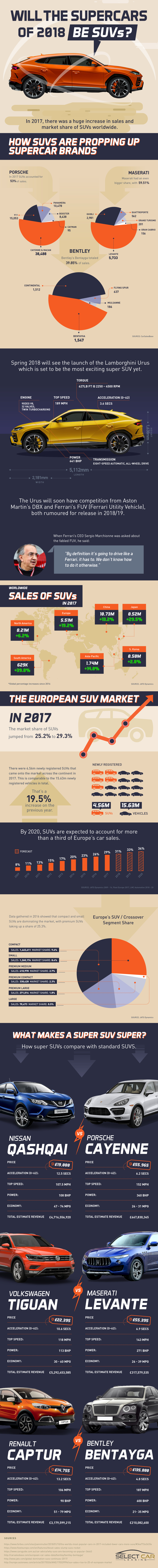 So will the supercars of 2018 be SUVs? Select Car Leasing have taken a look at the sales and recent growth in this market, how supercar brands are getting involved and what separates a 'super SUV' from a regular SUV.