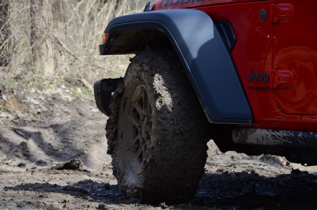 We hit the trails in a bunch of Wranglers in a lead-follow arrangement behind our guide vehicle. Jeep’s off-road team had spotters throughout the trails to coach us through the more challenging areas. We drove across and along stream beds that were running about 6 to10 inches deep. Many of the trails were quite soft and very muddy. In some areas along the way they had us going through 8 to 10 inches of mud.