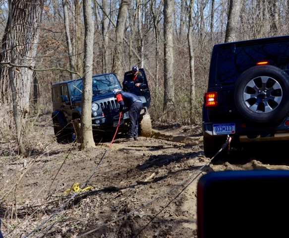 It is often said that tires make the difference and that held true today. The Rubicon is equipped with a tall and knobby 33-inch all-terrain tires. The Sahara has a more street-appropriate all-season tire. As Murphy’s Law would have it, a Sahara got stuck. It wouldn’t go anywhere. The Jeep team hooked up a tow harness and we tried to jerk it out of the mud with another Sahara. That didn’t work. Finally, the Jeep team had a Rubicon with a front winch. They rigged up a pulley-system on a tree and pulled the stuck Sahara free.