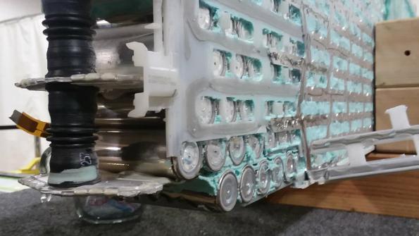 Everything in the Tesla is glued together, said Ellis. And he can attest to its toughness compared with welding or bolting parts together. He had to use chisels and a lot of muscle to break components apart. That also means that the battery packs in the platform are there for good. There's no swapping out an individual dead battery within the array for a new one. But he said that each battery cell is so small that if one did fail it would have virtually no impact on the total electrical charge propelling it.