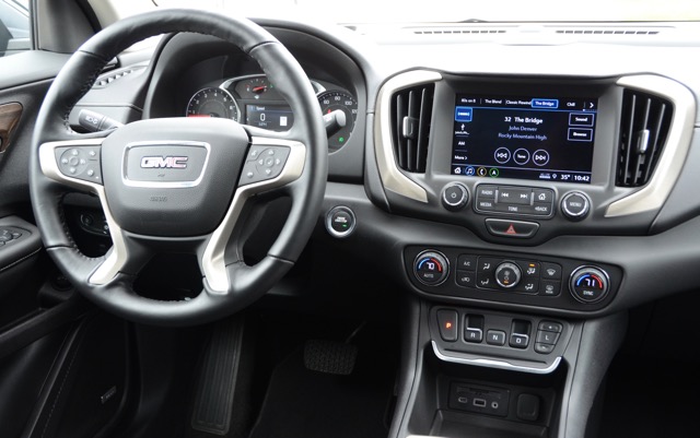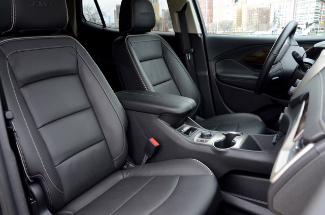 On the inside the Terrain Denali gets its own leather-trimmed seats that are heated in front, Denali-logo aluminum sill plates and unique Denali interior trim color. Surface treatments vary on the inside from padding to hard trim to some wood grain.