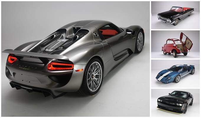Clockwise from left: Newly added to the Newport Car Museum's collection is a 2015 Porsche 918, a 1961 Chevy Impala SS 409 convertible, a 1957 BMW Isetta, the1965 Ford GT40 "Fast and Furious" movie car, and the 2019 Dodge Demon. (photo credit: B25 Studios/Ken Buschner) Individual photos available in high resolution by clicking image above